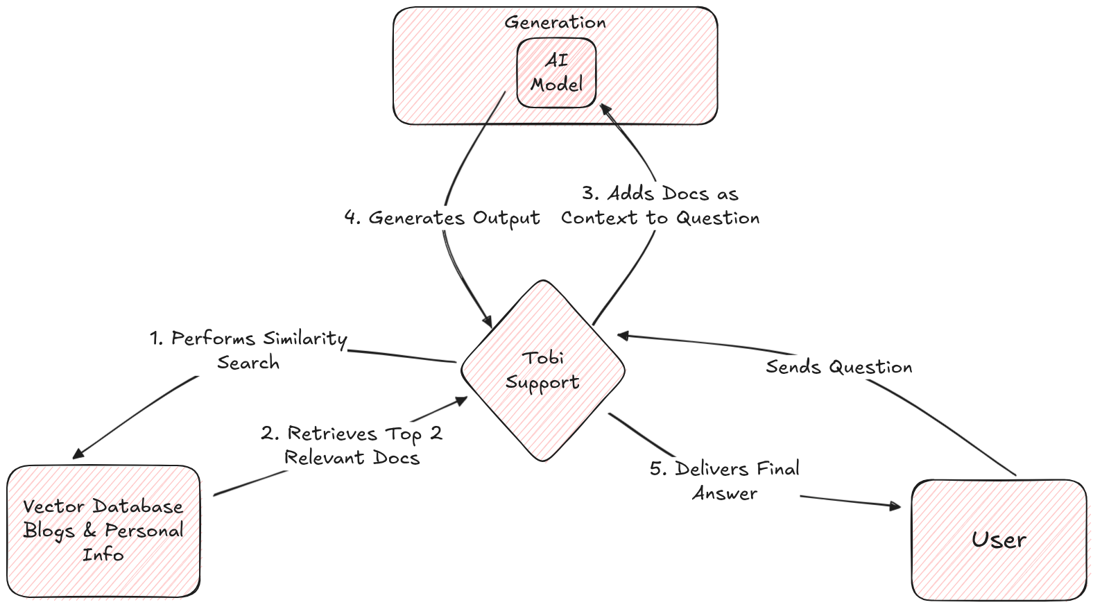 - The AI model generates a response, which Tobi Support then displays on the user interface.